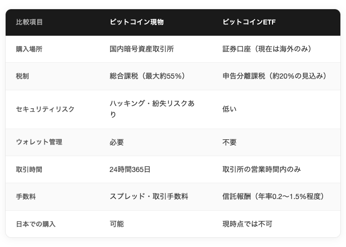 ビットコイン現物とETFは、同じビットコインの価格に連動しながらも、購入方法や税制など複数の点で異なります。