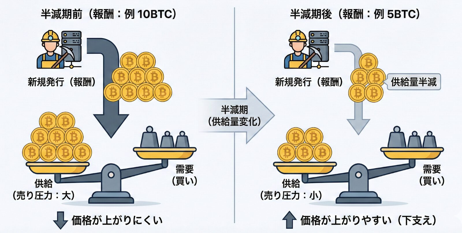 半減期後は報酬が半分になるため、市場に出回る新規コインの量も減少します。