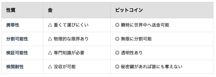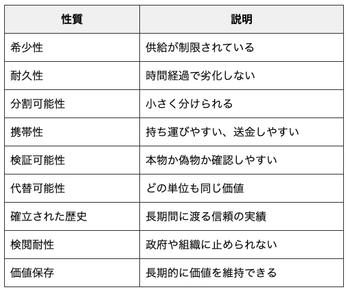 ビットコインも同様に、希少性や検閲耐性、携帯性といった性質によって価値保存機能を提供しています