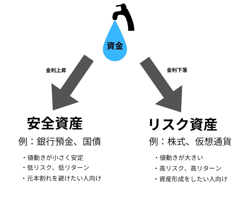 すると投資家は、リスクを取らなくても安定した収益が得られるため、リスク資産から資金を引き上げて安全資産に移すのが一般的です。