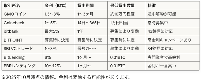 ビットコインのレンディングに対応した主要7社を比します。