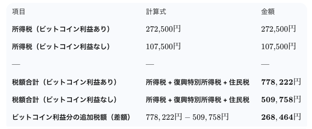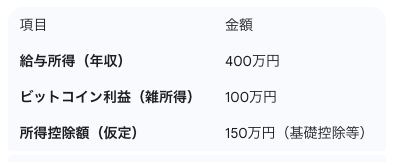 年収とビットコインの利益を合算した金額で税率が決まるため、利益が大きいほど税負担も重くなります。