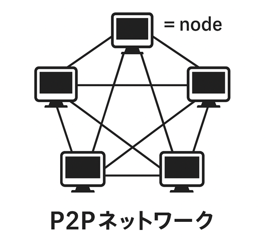 またプログラムをダウンロードして取引に参加している端末(ノード / node)がP2Pネットワークを構築しています。