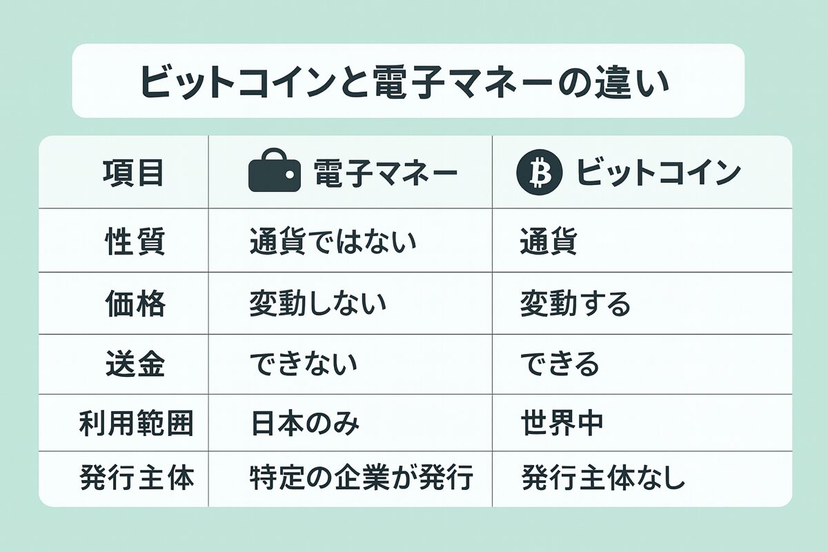 一見似てそうな両者ですが、電子マネーとビットコインは別物ということになります。